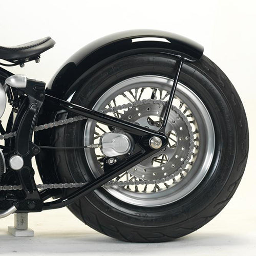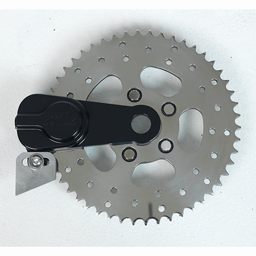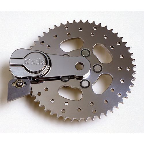 The Sprocket Brake Kit is a signature item on all Exile bikes. The rear brake and final drive sprocket are combined into one great-looking unit, cleaning up the rear wheel completely. The polished stainless steel sprocket/rotor is combined with a slick two-piston billet aluminum caliper - available caliper finishes are raw machined aluminum, polished aluminum, black anodized or chrome. The Sprocket Brake Kit is only available with a 50 tooth sprocket (the 48T Sprocket Brake Kit is discontinued). Left or right-side drive options.